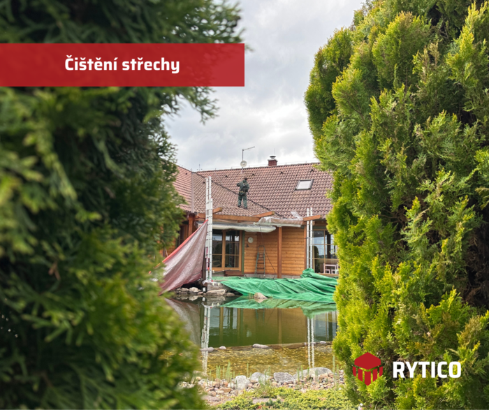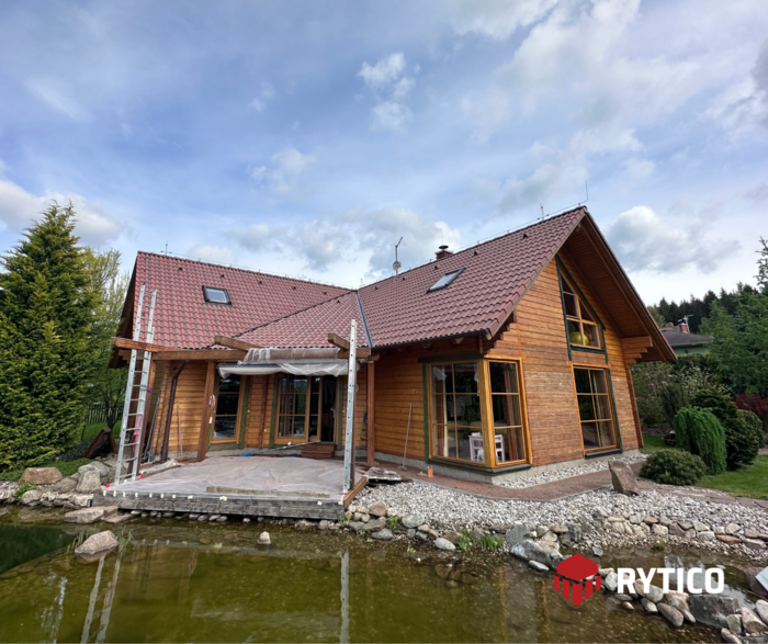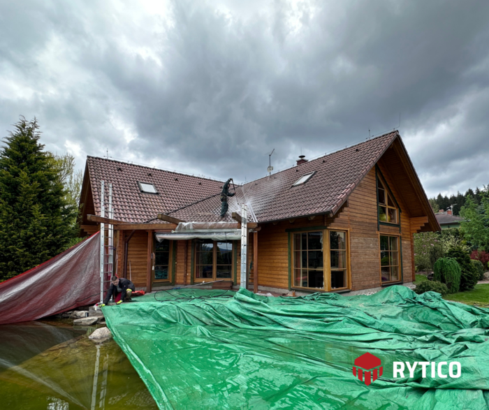 V červnu 2023 se náš střechařský tým pustil do práce na tomto domě. Před realizací bylo zapotřebí ochránit krásný rybníček před domem od případných nečistot. Následně byly odstraněny mechy a lišejníky tlakovou vodou, nakonec byla aplikována vrstva dlouhodobé ochranné impregnace.