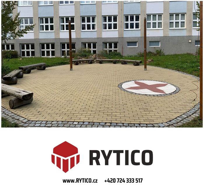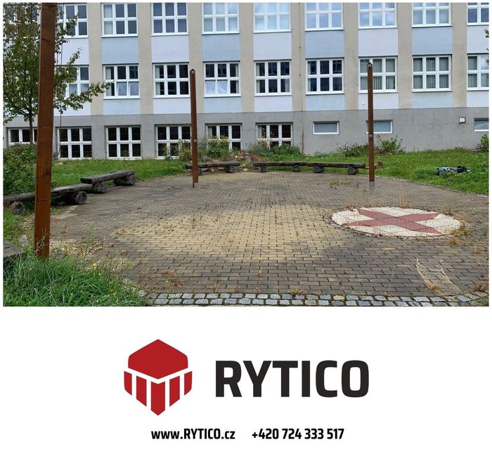 Takto jsme proměnili zámkovou dlažbu dětského hřiště - častým používáním byla v průběhu let poměrně silně znečištěna. Po vyčištění jsme plochu zasypali křemičitým pískem, aby se již ve spárách tráva a mech neobjevovaly.