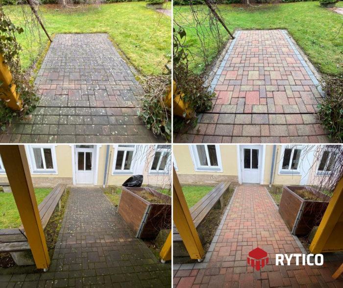 V březnu 2023 jsme obyvatelům Domova pro osoby se zdravotním postižením „Pramen“ v Mnichově takto vyčistili venkovní dlažbu. Následně byla dlažba naimpregnována proti dalšímu usazování nečistot.