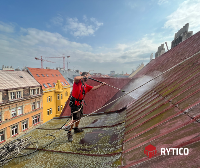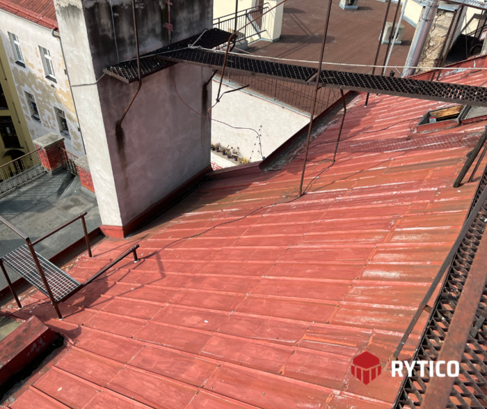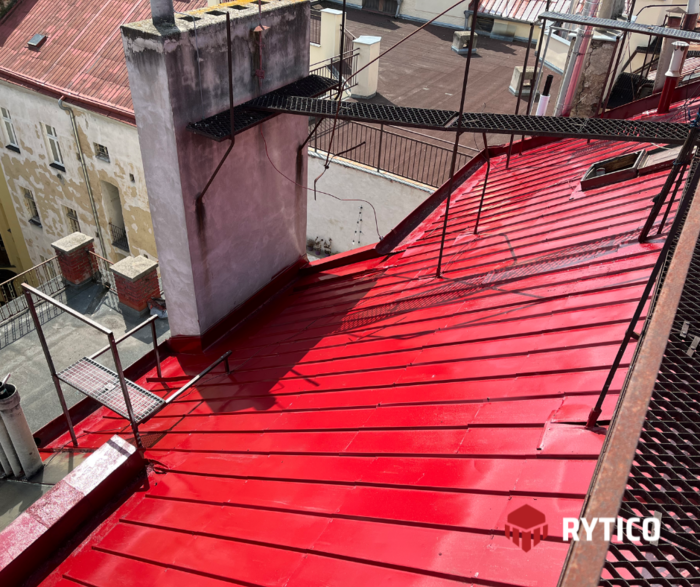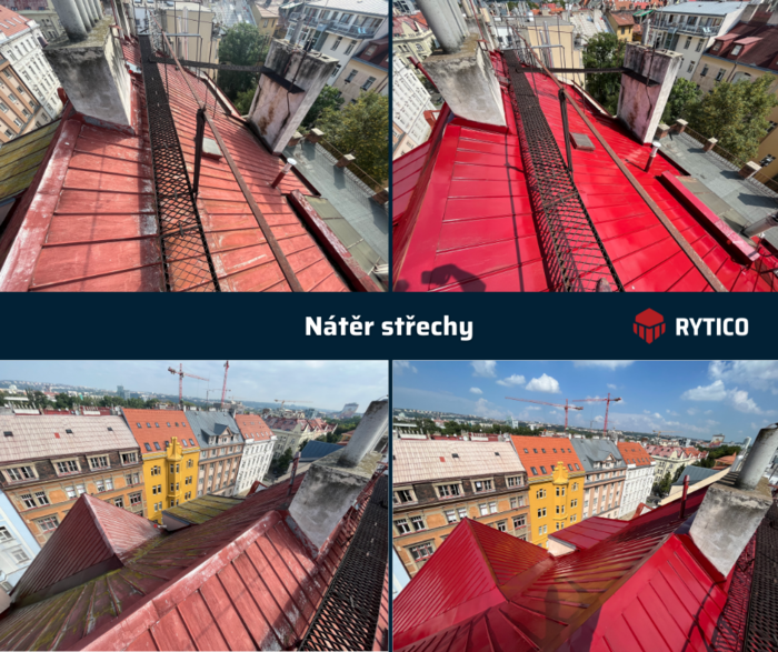 Tuto střechu renovovala naše společnost na bytovém domu v Praze-Karlíně. Nejprve byla střecha vyčištěna, následně byly aplikovány 2 nástřiky barevného nátěru RAL 3011.