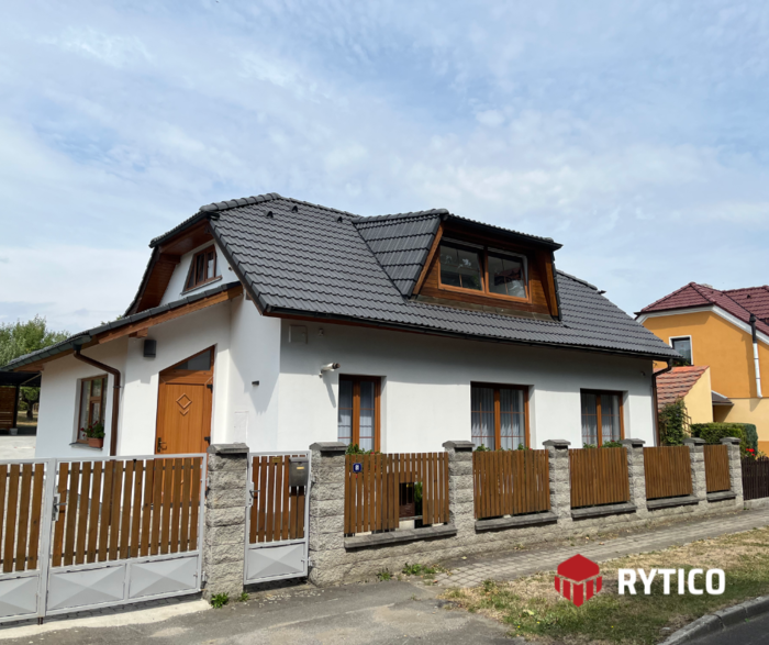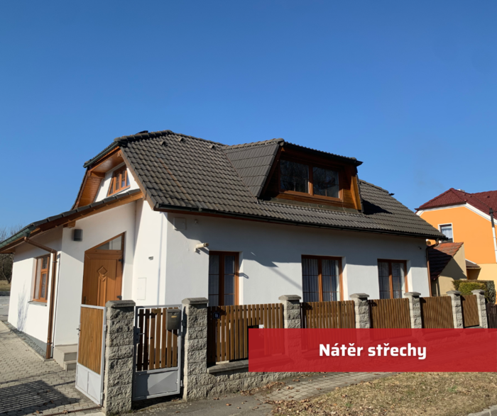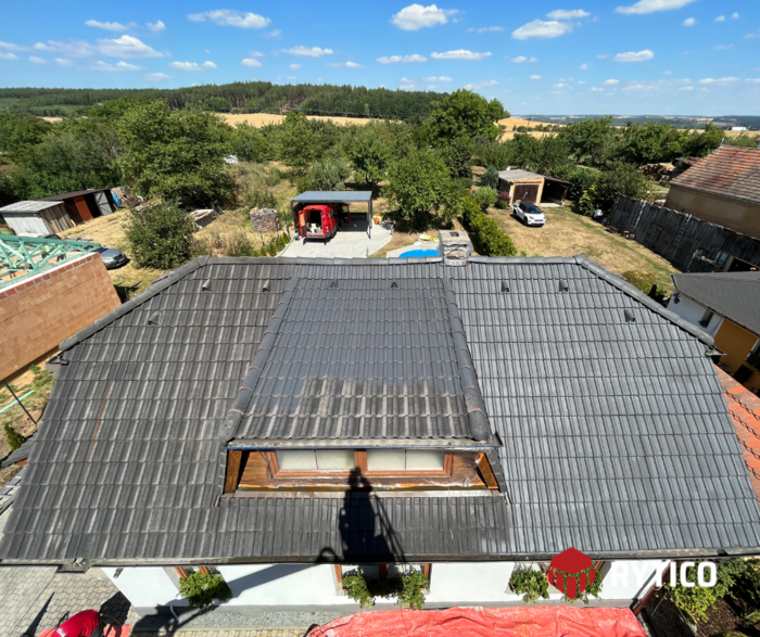 Za 15 let nasbírala tato krytina, která chrání dům na předměstí Plzně, patrné množství mechu a lišejníků. Naší prací jsme stárnutí střešní krytiny výrazně zpomalili. I zde jsme nanesli dva nátěry populární antracitové RAL 7016.